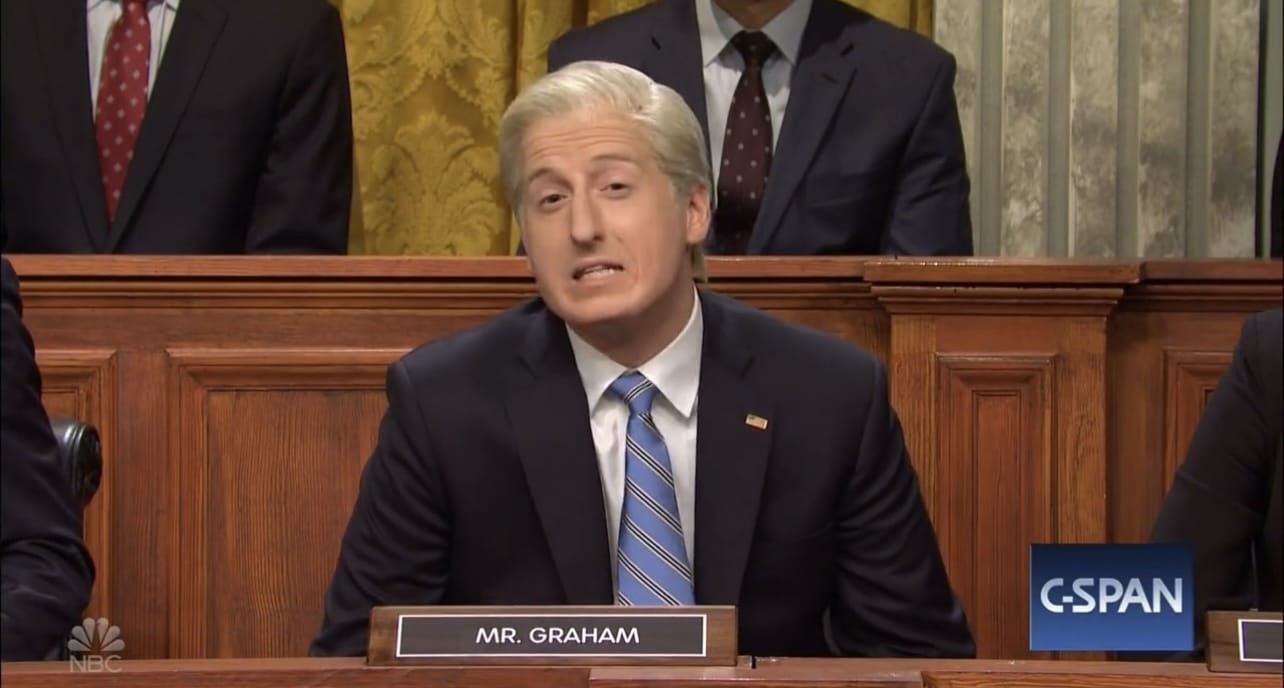 - James takes over Kate’s nightmare fueled take on Lindsey Graham, and does a much better take on him. Quite the funny voice he’s using here.