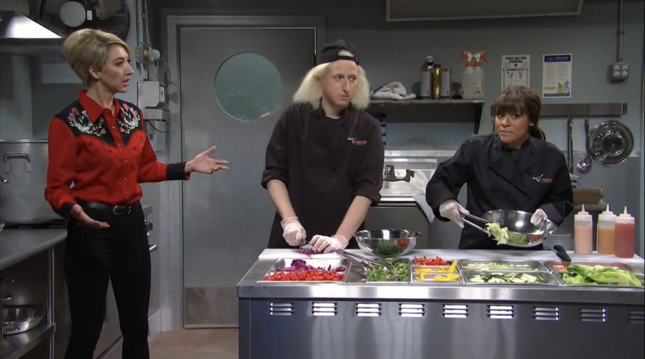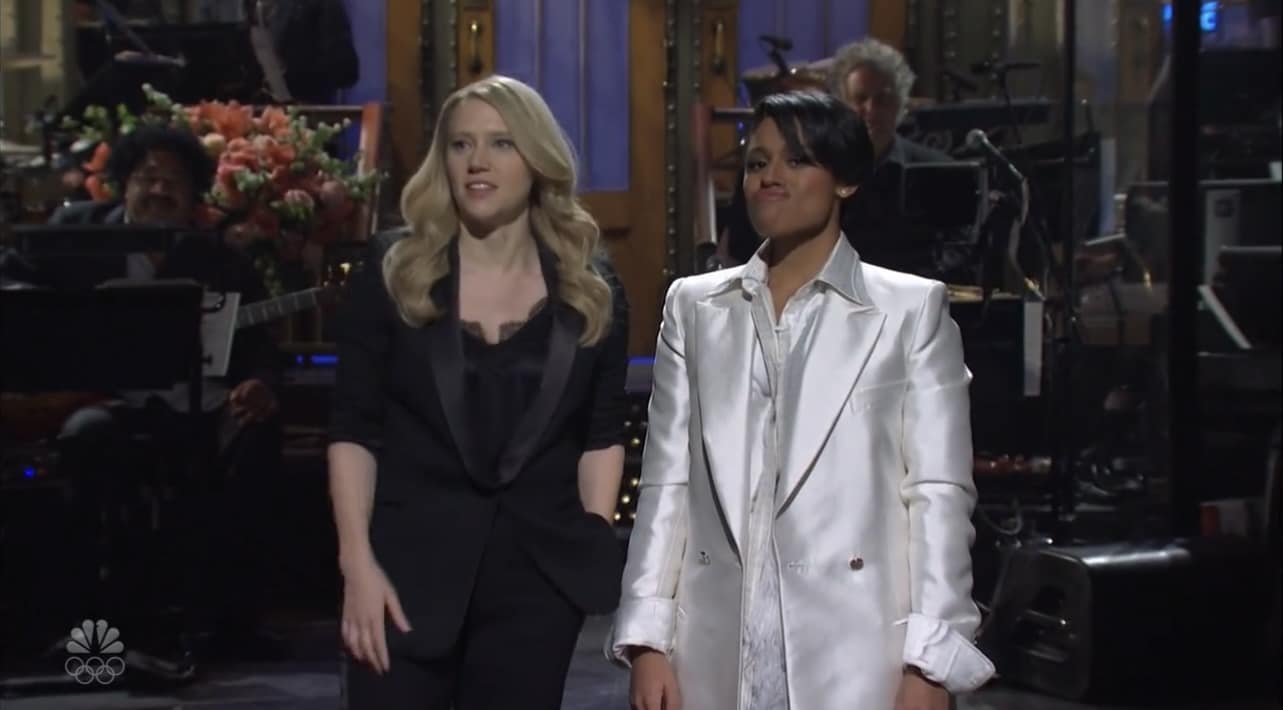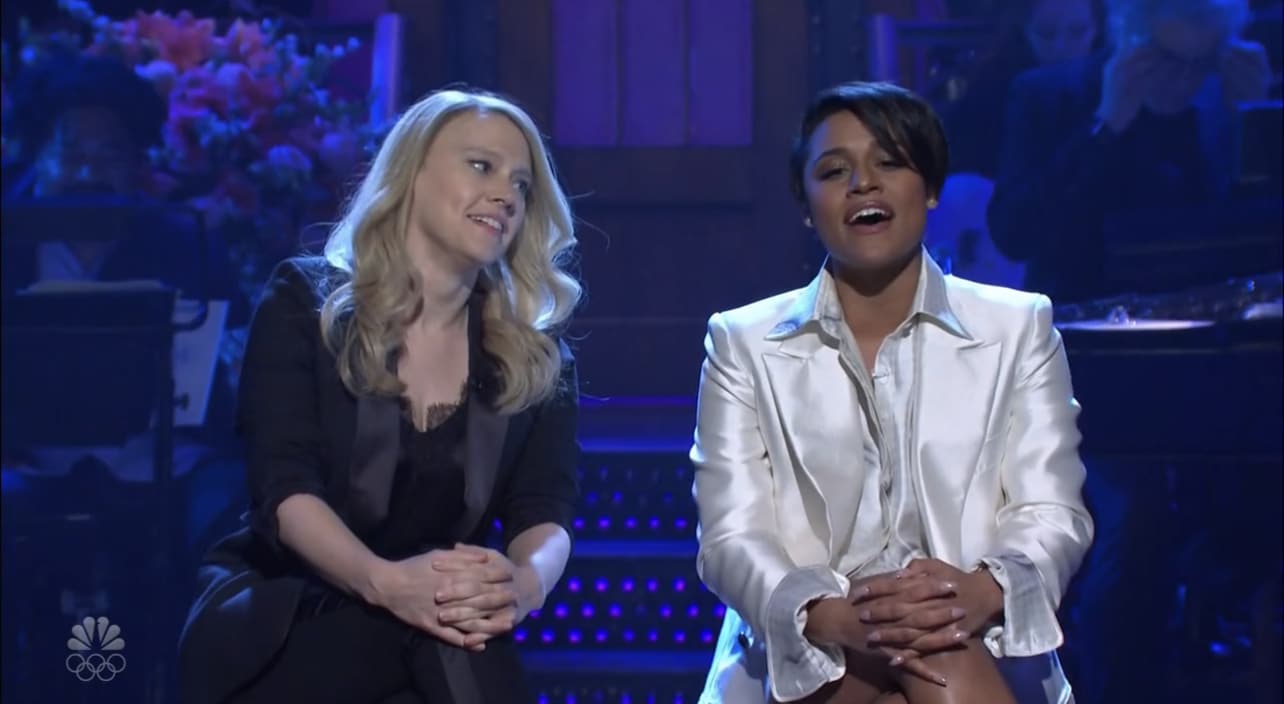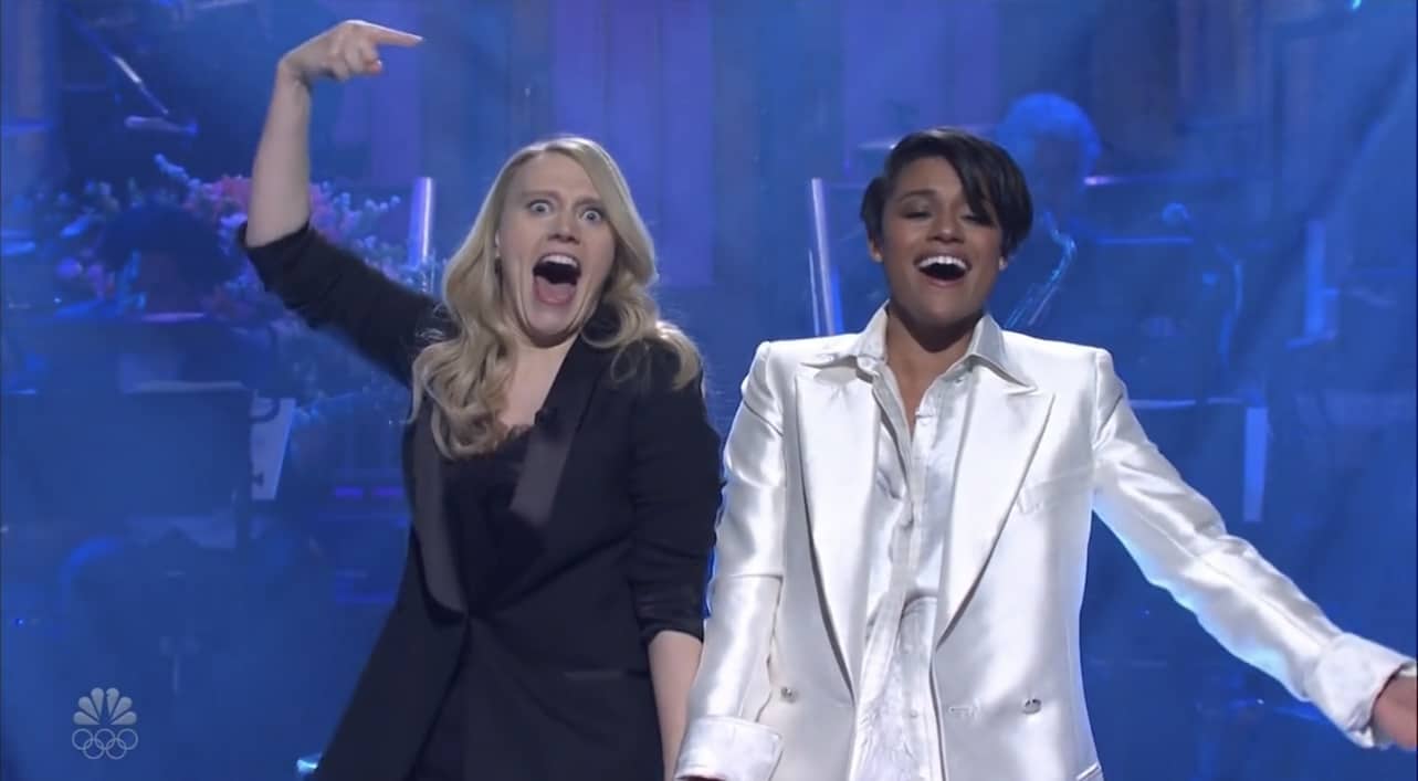 - Kate shows up here, I would whine, but I happen to like Kate MUCH more than either Aidy or Cecily, and this also breaks the host-only monologues, and pretty much confirms one of my wishes for a musical monologue.