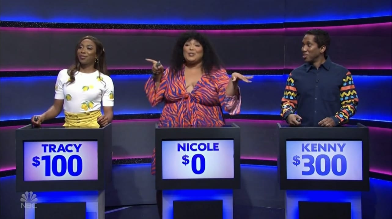 - Oh, I’m absolutely LOVING the part where Lizzo turns the table against Kenan’s game show host and starts to question him and the rules of the game, an excellent twist to the usual by-the-numbers SNL game show sketches.