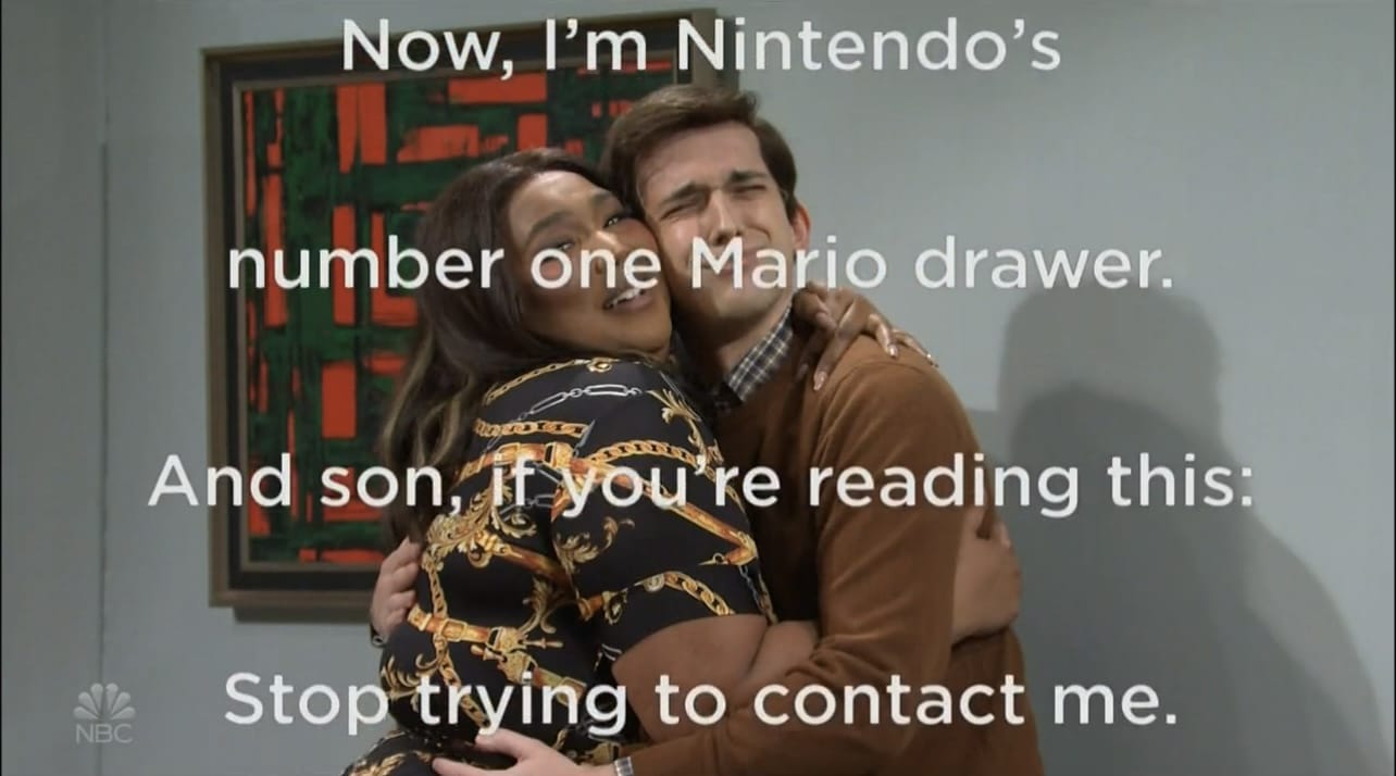 - Huge laugh from Mario’s drawing looking like Luigi.
