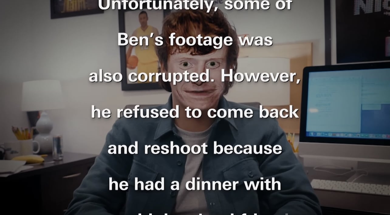 - Flawless and very funny back-and-forth between the original footage and the “fixed” one throughout this piece.