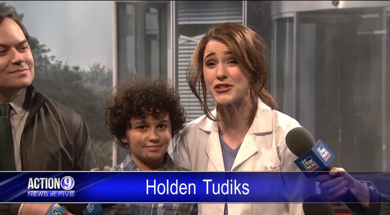 - Hmm, the kid’s name being Holden Tudiks actually gave me a cheap laugh; my first genuine one of this entire sketch. However, the name sounds eerily familiar to one of the various priceless names in that great Let’s Talk Books sketch from the season 25 Joshua Jackson episode (one of my favorites from that entire era): Holden and Sharen Dicks, but that’s probably a coincidence.
