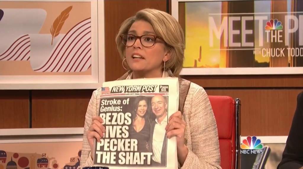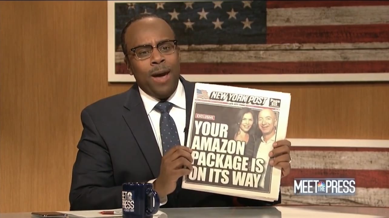 - A juvenile premise around Bezos’ infamous phone hacking scandal at the time. However, this cold opening is pretty decent so far covering such a topic. Kenan is especially shining here and nailing his lines as usual.