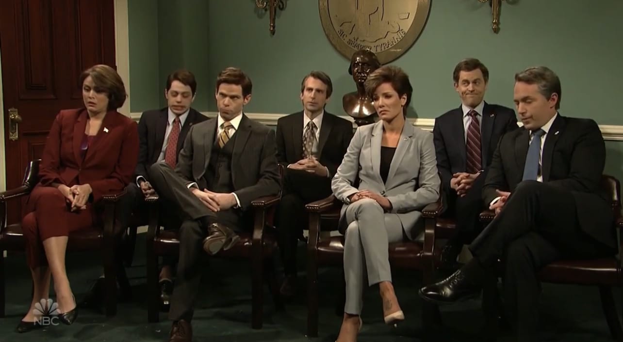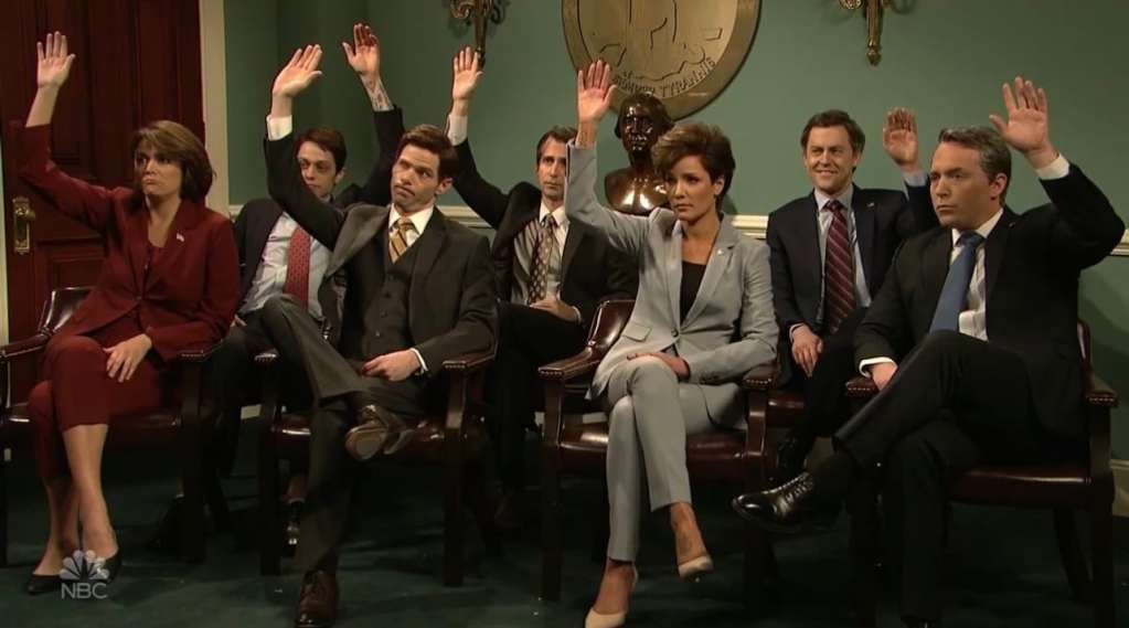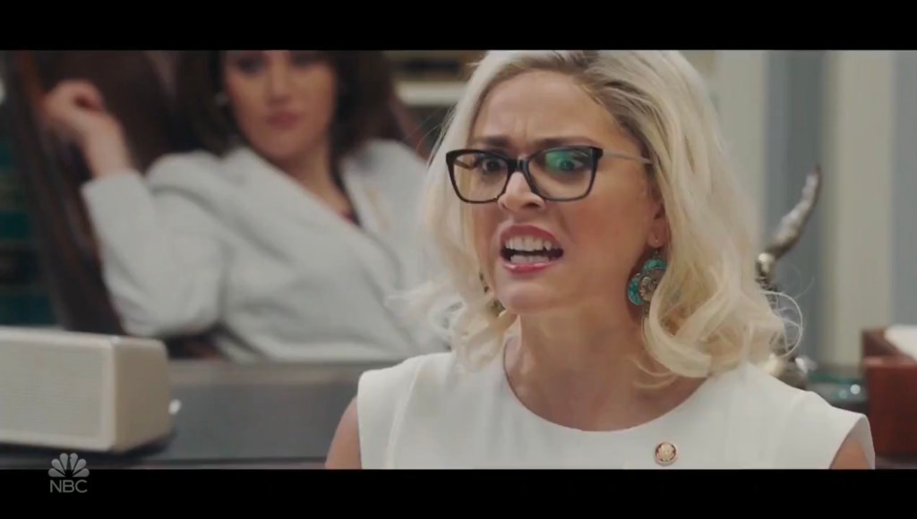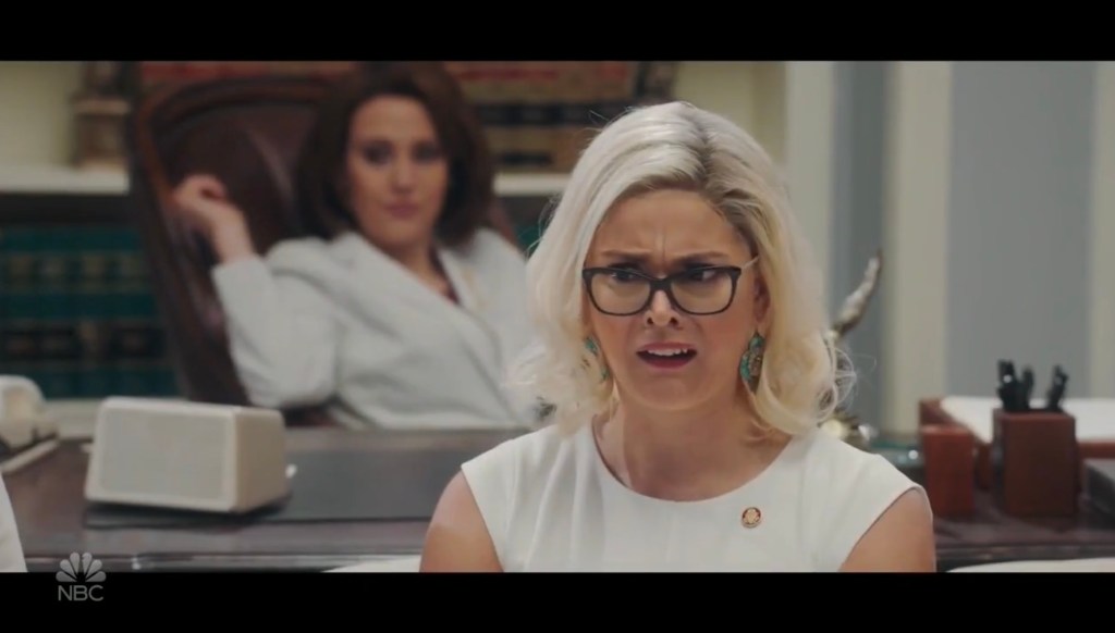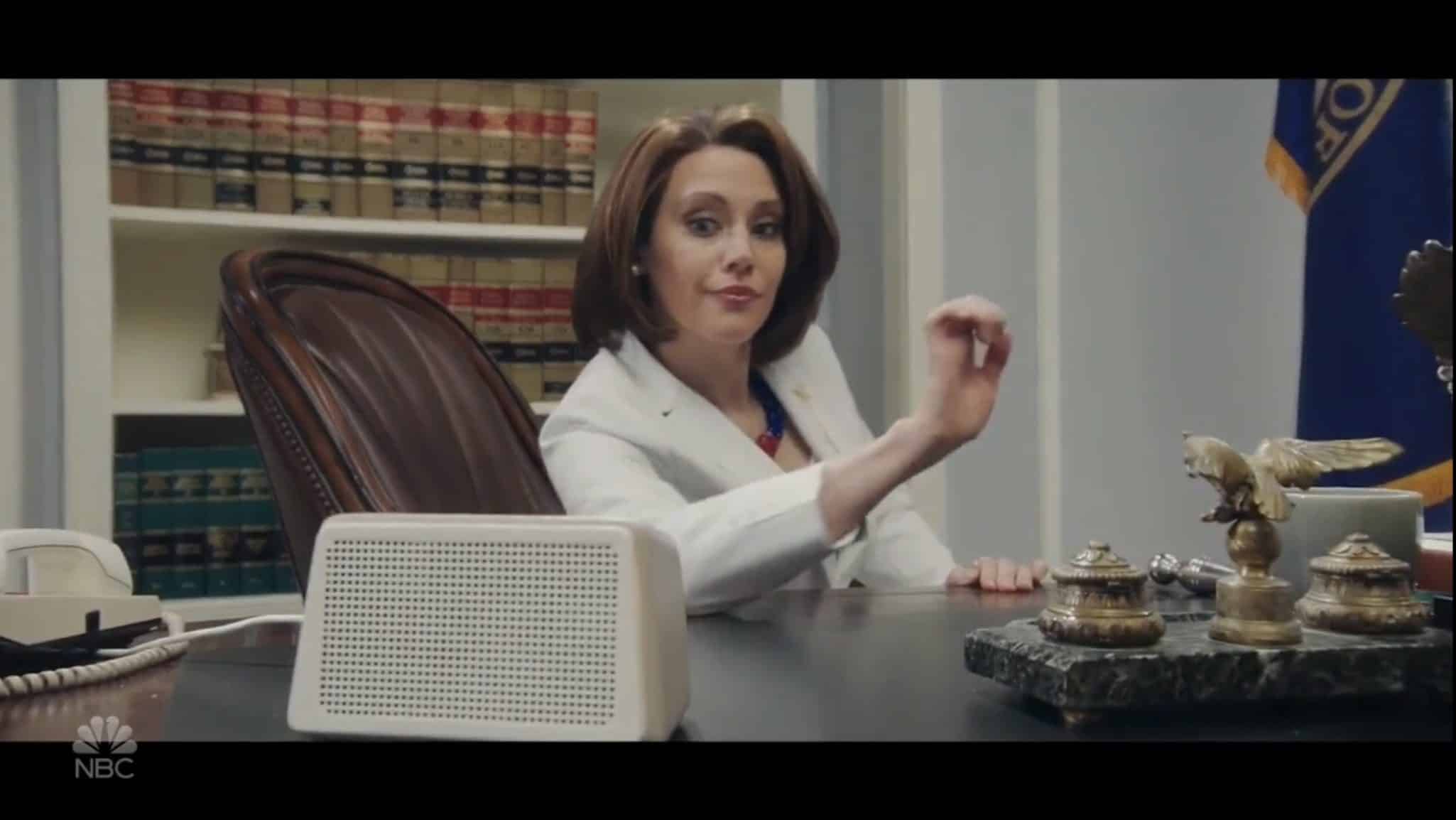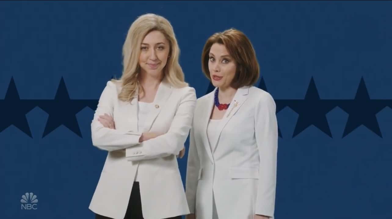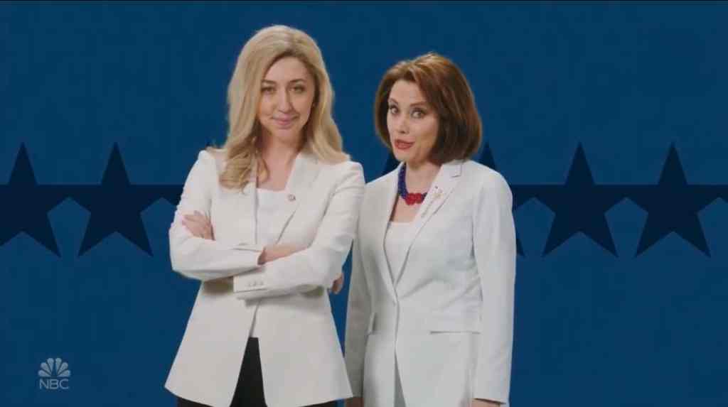- Very fun quick intros, with the ladies getting moments to shine; my favorite part here is Kate’s Pelosi, as it sounds even more dead-on and funny; the dead eyes stare next to Heidi in particular is great.