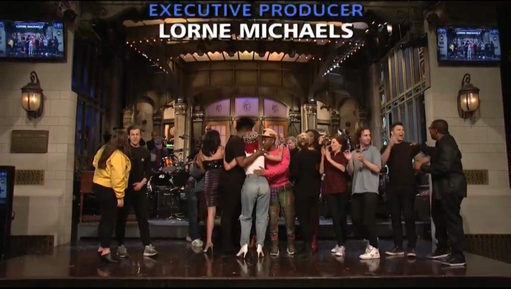 - Fantastic ending visual with everyone raising their hands admitting wearing blackface back in the ‘80s which causes Kenan to walk out. A perfect ending to a perfect sketch; one of the best from this era.