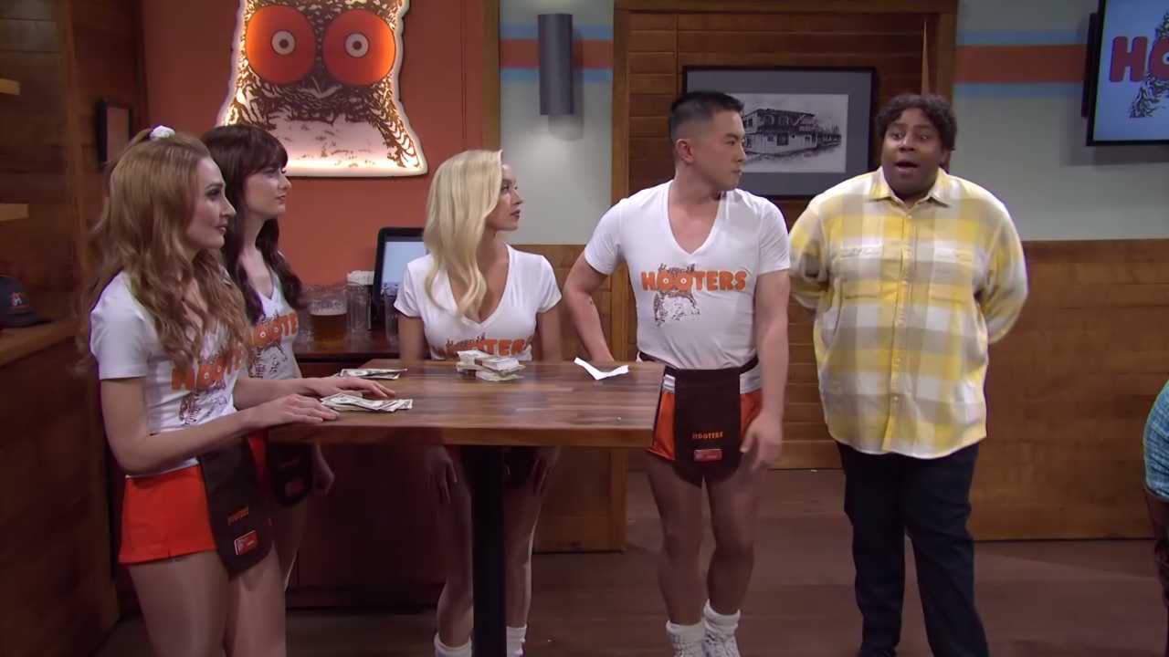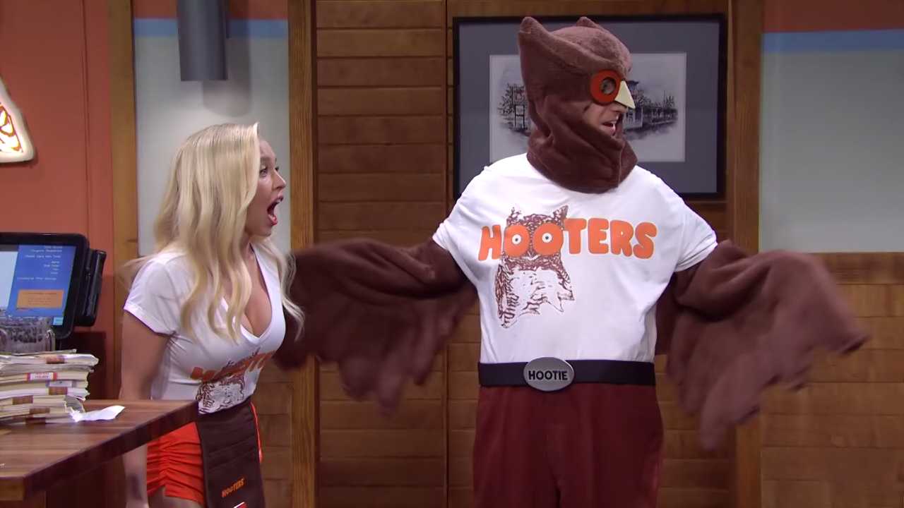 - A Hooters-based sketch? Considering who’s hosting tonight, I guess the “creative” premise behind this sketch makes sense.